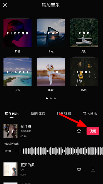 如图,进入添加音乐窗口,这里有四个栏目,分别是【推荐音乐】、【我的收藏】、【抖音收藏】、【导入音乐】,选择推荐音乐,点击歌曲名称,然后点击【使用】,
