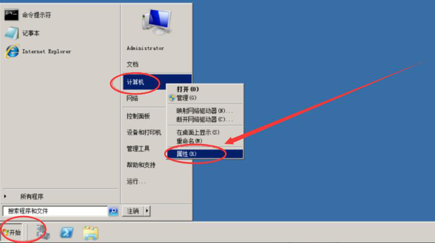 1、首先,我们先启动win2008 r2系统。在“开始”菜单中,依次点击“计算机”、“属性”。