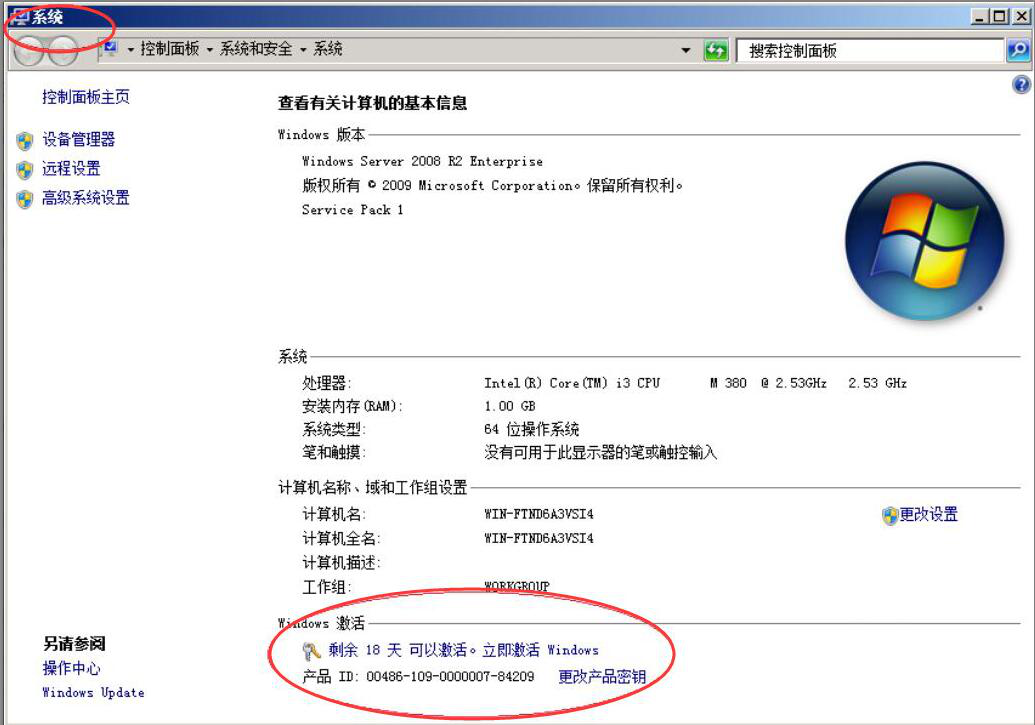 2、在电脑系统属性界面中,我们可以看到win2008 r2系统的试用期还有18天。