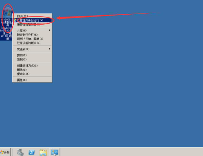 3、然后,右键单击桌面上的Win2008_R2系统激活工具,并在右键菜单中点击“以管理员身份运行”。