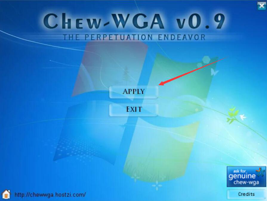 4、接下来,在“CHEW-WGA v0.9”的程序窗口中,我们直接点击“APPLY”按钮。