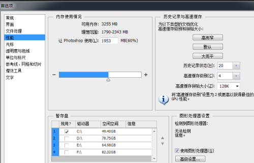 2、在左侧列表中点击【性能】,此时窗口右侧会显示有关性能的设置:内存使用情况、历史记录与高速缓存、暂存盘等。