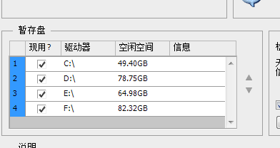 5、暂存盘是PS暂时存放的位置盘,盘符可用空间越大,在一定程度上也可以减少卡顿,因此一般选择空闲空间较多的盘符,如果提升不明显,也可以全部勾选。设置好之后,点击右侧【确定】保存设置即可。