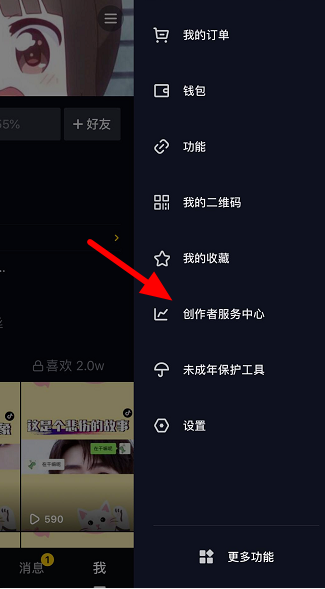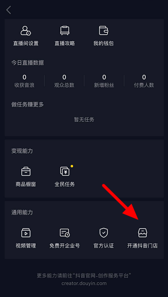 出现侧栏界面,点击【创作者服务中心】,然后点击【通用能力】——【开通抖音门店】,
