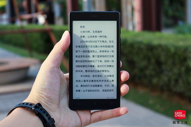 口袋阅最吸引我的地方就是像手机一样的产品形态,它的外观尺寸和几年前的红米千元机差不多,拥有 5.2 英寸的屏幕、7.9mm 的厚度、120g 的重量,单手持握完全不成问题,揣在口袋里也很方便,很适合我这种时间碎片化、追求轻量出行的人。