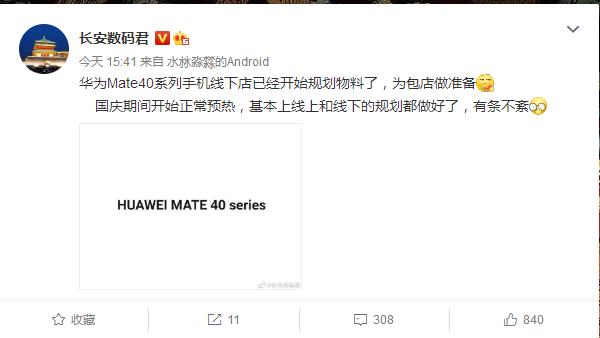 来自国内微博数码博主@长安数码君爆料,一直以来备受行业瞩目以及用户关心的华为Mate 40系列发布筹备阶段已经进入收尾阶段,目前已经开始在部分线下店逐步规划物料,预计将在十月正式开启预热阶段,正如在此之前华为消费者业务CEO余承东在2020华为开发者大会透露的一样“新款Mate旗舰再等一等,一切都会如期而至。”