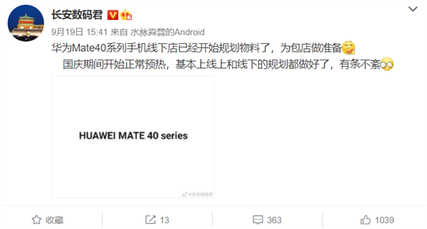 按照惯例来推测,华为Mate40系列将于10月于大家正式见面。据数码博主@长安数码君 爆料:“华为Mate40系列手机线下店已经开始规划物料了,为包店做准备,国庆期间开始正常预热,基本上线上和线下的规划都做好了,有条不紊。”