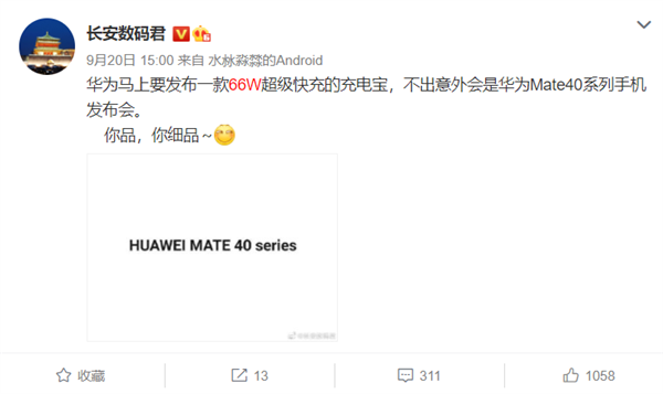他还透露,华为马上要发布一款66W超级快充的充电宝,不出意外会是华为Mate40系列手机发布会。这与此前华为Mate40系列升级66W超级快充的爆料不谋而合。