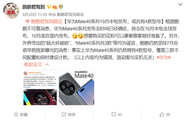 该博主表示,外界传出的“超大杯被砍”、“Mate40系列共3款”等均为谣言,事实上华为Mate40系列仍然拥有4款型号,覆盖三款不同配置和保时捷设计款。