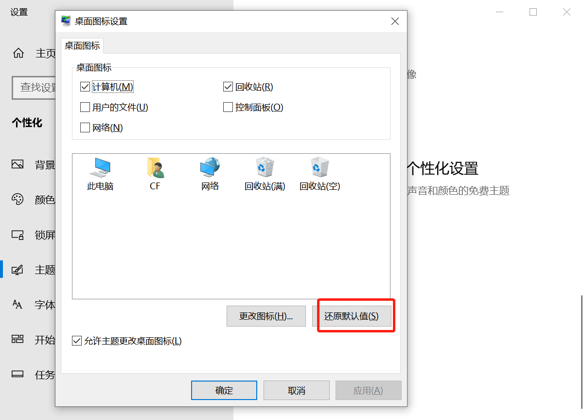 点击进入桌面图标设置页面,点击【还原默认值】,返回桌面,查看是否解决问题。