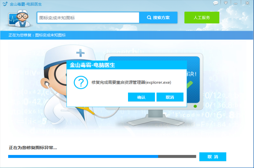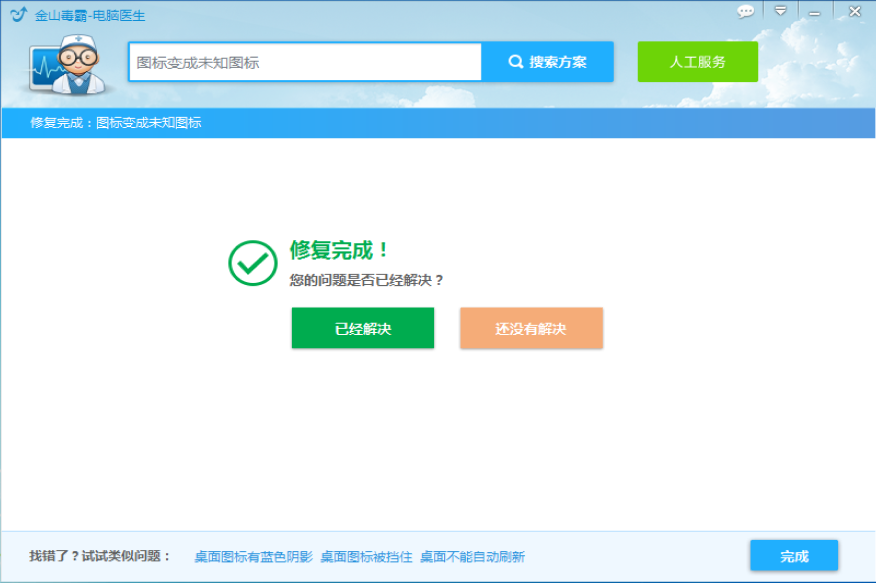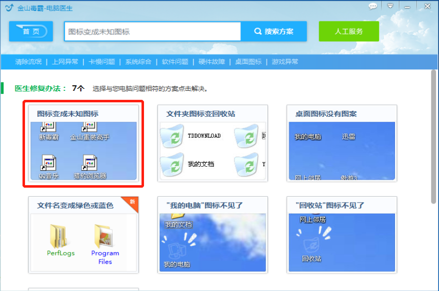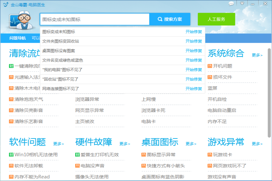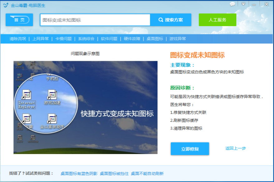 启用金山毒霸电脑医生服务,在搜索框中输入【图标变成未知图标】,点击查找问题答案,