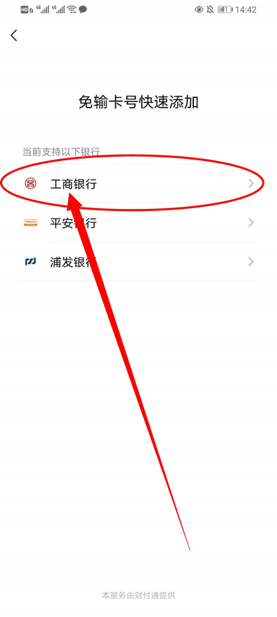 2、在“免输卡号快速添加”界面选择想要绑定的银行卡,点击进入(下面小编以工商银行为例)。