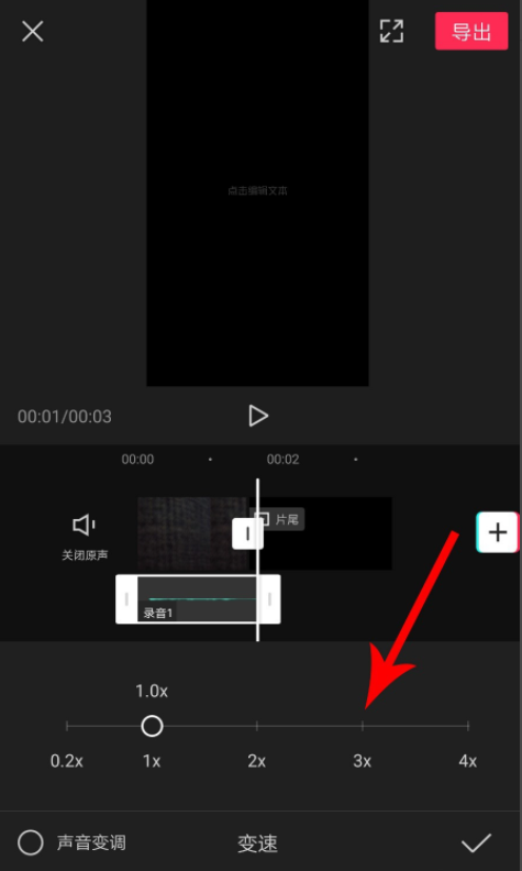 进入变速设置界面,点击【3X】,录音播放速度就会变成3X,然后点击【√】,保存设置,最后导出视频。
