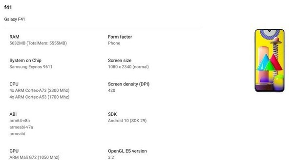 此前,该产品的配置信息已在网上曝光。据爆料显示,三星Galaxy F41搭载了三星自家的Exynos 9611处理器,运存为6GB,屏幕分辨率为2340×1080,运行Android 10系统。从曝光的配置信息来看,这款手机满足普通用户的日常使用需求是没有问题的。