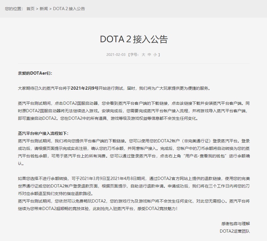 公告显示,蒸汽平台测试期间,点击DOTA2国服启动器,你会看到蒸汽平台客户端的下载链接,点击该链接下载并安装蒸汽平台客户端。同时原DOTA2国服启动器将无法继续进入游戏。安装完成后,你需要完成蒸汽平台帐户接入流程,并将游戏导入蒸汽平台客户端,即可直接启动DOTA2。你在DOTA2中的所有道具、游戏等级及游戏权益等信息都不会发生任何变化。