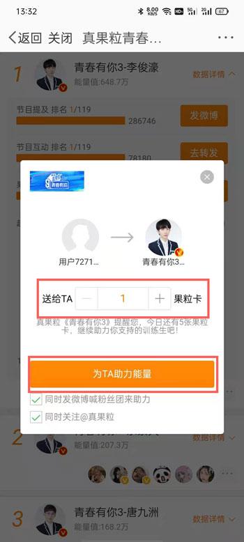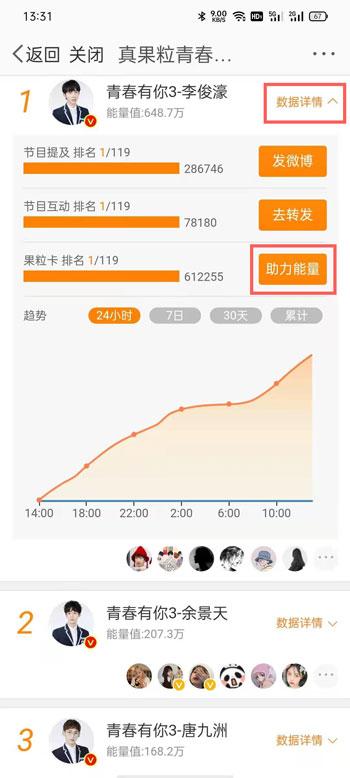 3、下滑找到想要投票的练习生,点击右侧的【数据详情】展开,点击【助力能量】;