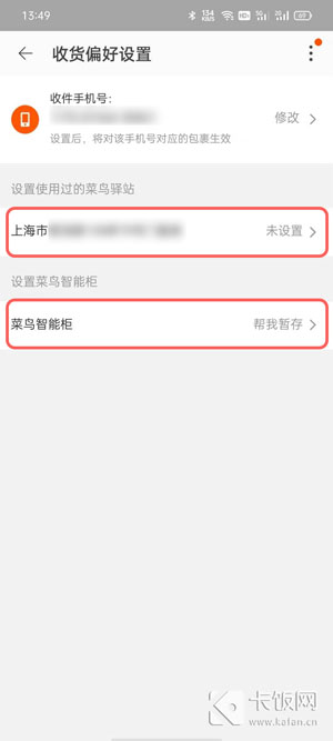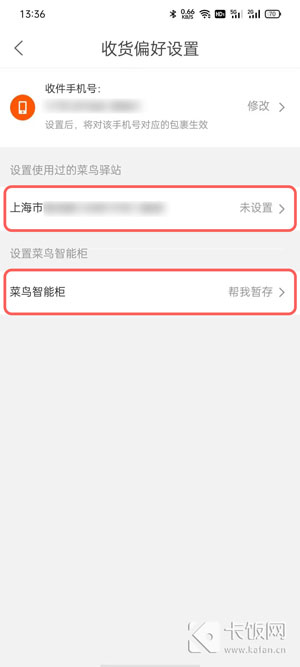 5、进入收货偏好设置页面,可选择修改菜鸟驿站和菜鸟智能柜的存放方式;