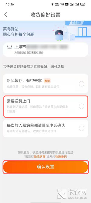 6、点击需要设置的【菜鸟驿站】进入设置,选择【需要送货上门】即可避免快递存放在菜鸟驿站中;