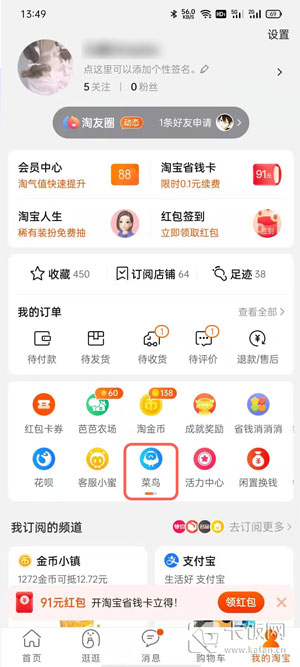 ①、打开手机淘宝,登录自己的淘宝账号,进入【我的淘宝】,找到下方的【菜鸟】;