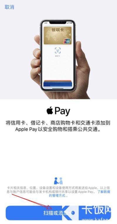 4、进入添加绑定卡页面后,点击下方的【扫描或添加卡】按钮;