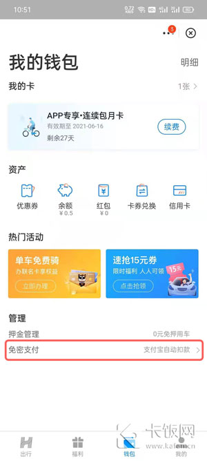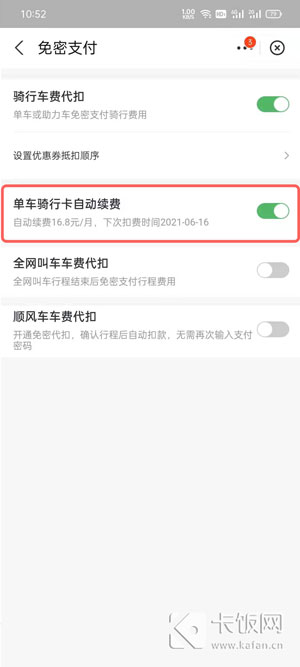 3、在免密支付中,找到需要取消自动续费的【骑行卡自动续费】;