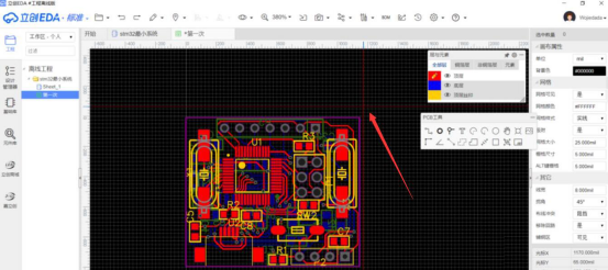 3. 接下来,可以看到立创 EDA 的编辑区域,多了十字交叉的红色虚线,它可以方便我们精准定位。