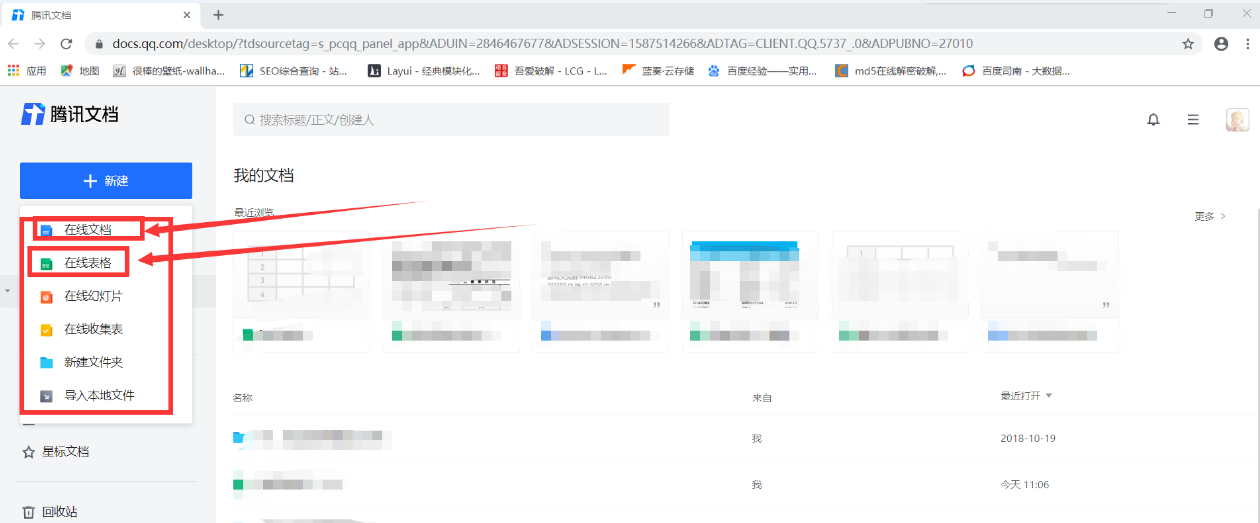 进入腾讯文档官网,如图,点击“新建”,展开下拉列表,你可以创建文档、表格、幻灯片,可以导入本地文件,