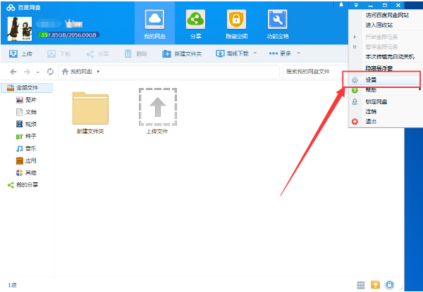 1. 首先我们打开百度网盘客户端并登录账号,接着在网盘主界面右上方的菜单中打开“设置”;
