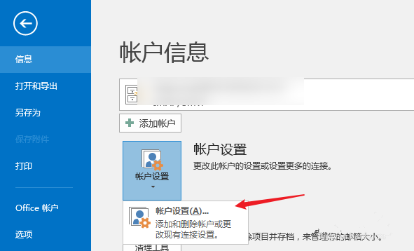 打开 Outlook 软件,进入界面,点击“文件”菜单,进入信息界面,然后点击“帐户设置”,