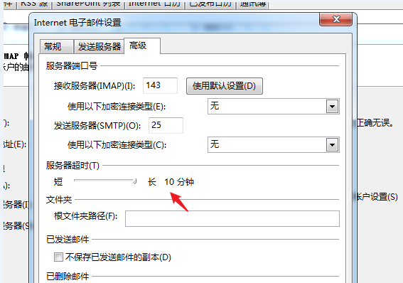 点击“服务器超时”,将其设置为 10 分钟,这样就可以利用 10 分钟时间来发送一封邮件,