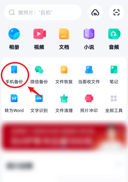 然后在安卓手机中打开百度网盘,登陆同一账号,进入界面,点击“手机备份”功能,
