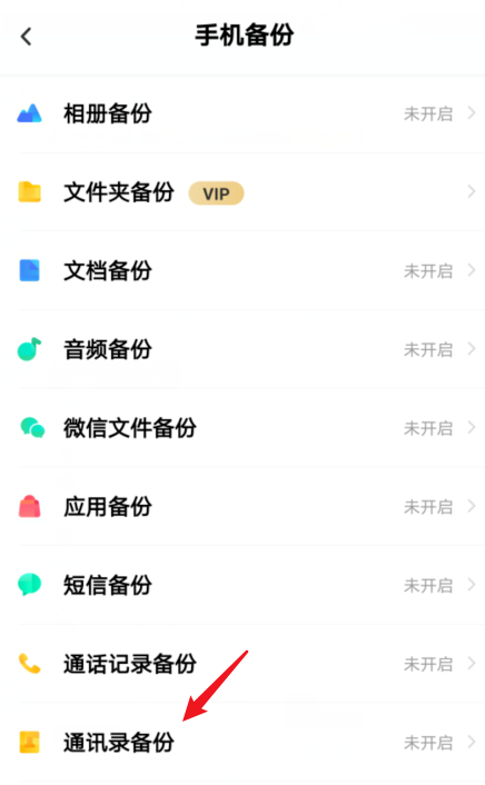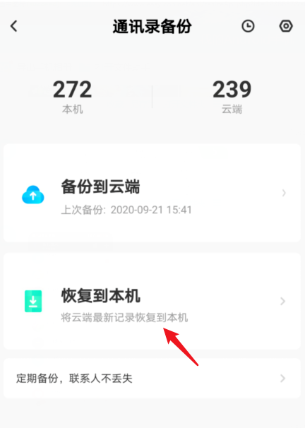进入以下界面,点击“通讯录备份”,然后选择“恢复到本机”的选项,