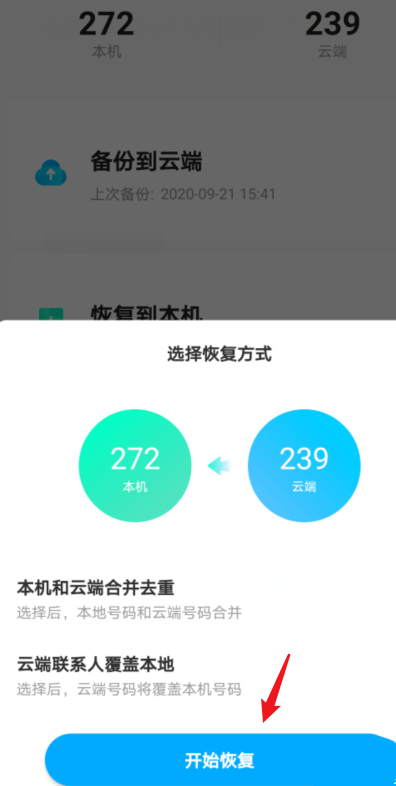 选择开始恢复的选项,恢复成功,即可将苹果手机的通讯录导入到安卓手机。