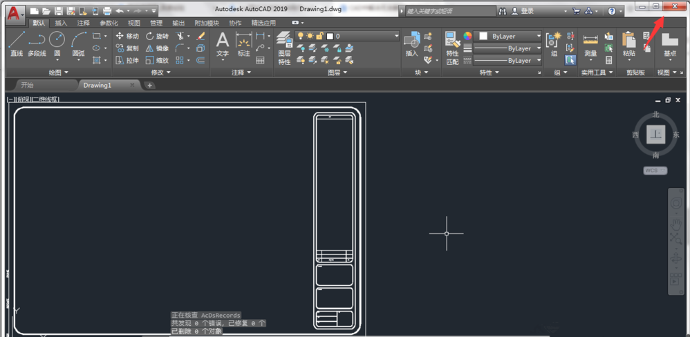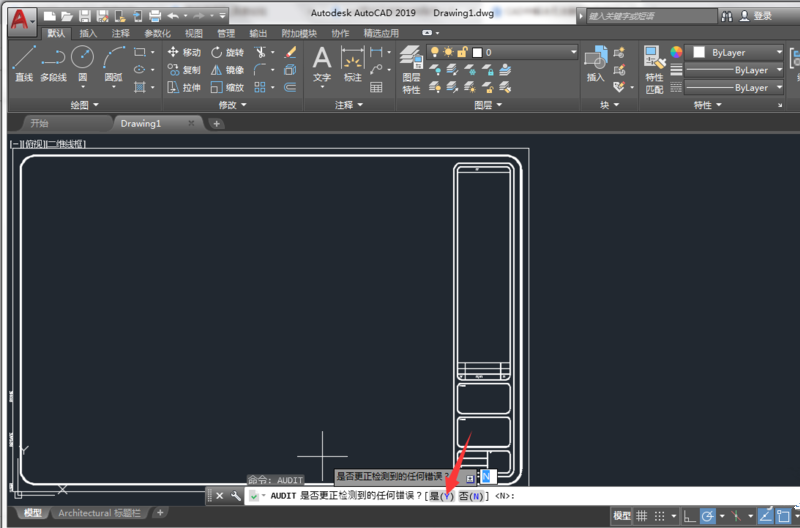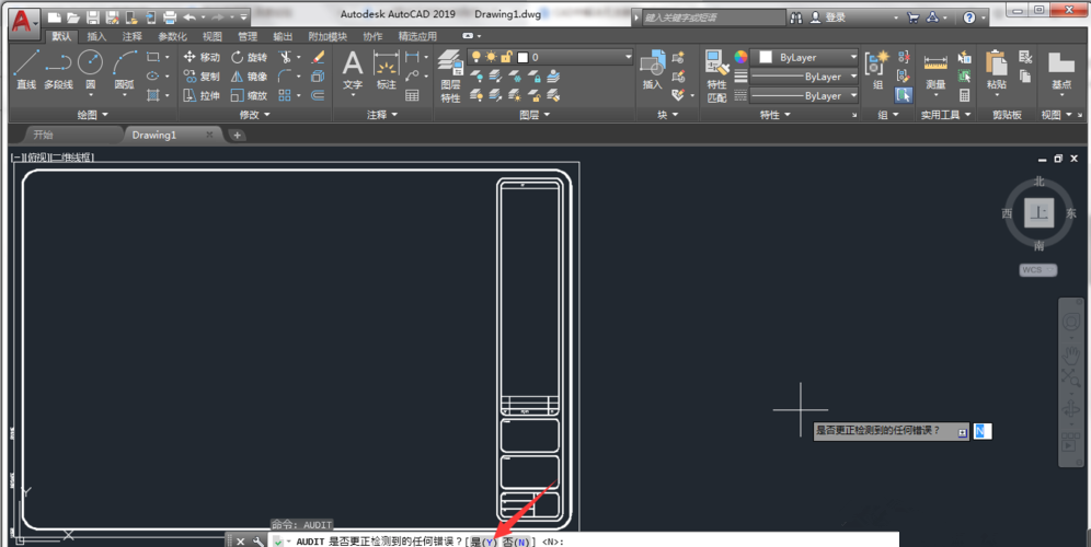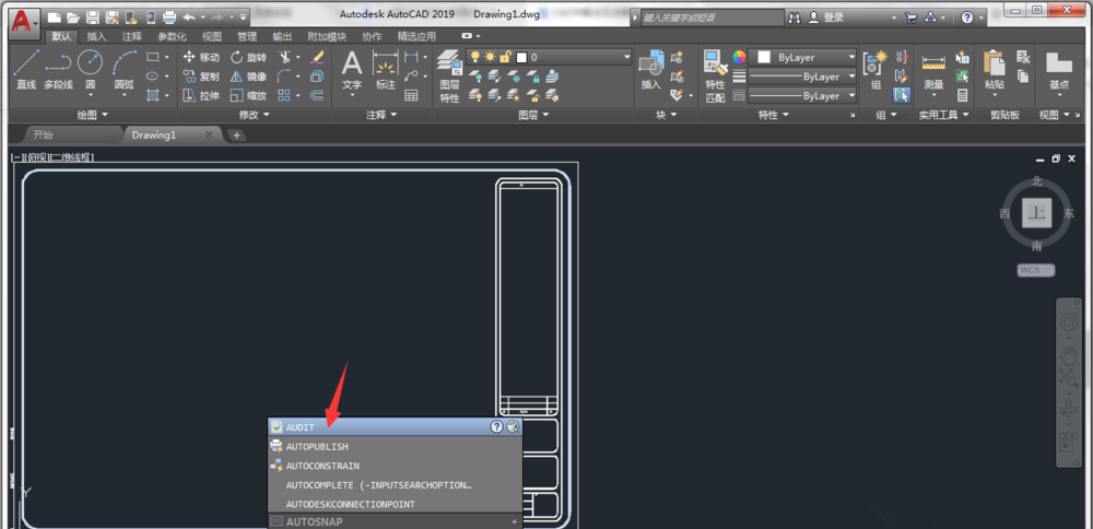 打开 AutoCAD 2019,进入编辑界面,输入Audit 命令,回车,如图,