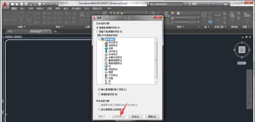 打开清理窗口,点击“全部清理”,清理图形中无效或者无用的对象,清理完成,点击关闭,