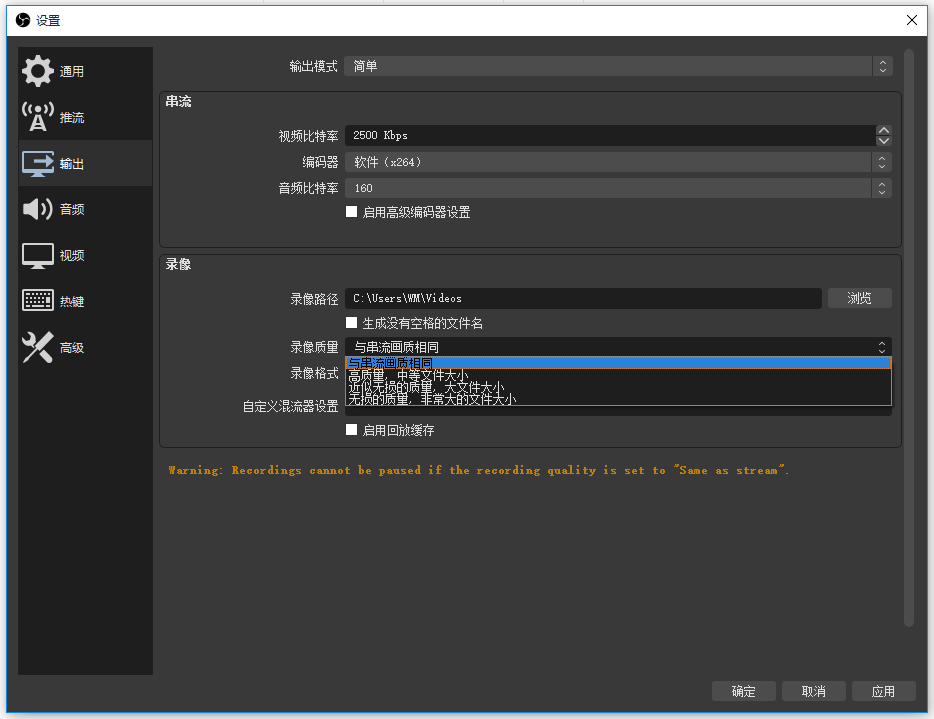 然后点击“输出”标签,调整“录像质量”,这里有四个选项,包括“与串流画质相同”、“高质量”、“近似无损的质量”、“无损的质量”,小编建议选择“近似无损的质量”,弄好之后,点击确定,