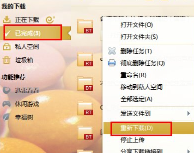 1. 导致此类问题产生的最根本原因是由于视频文件被损坏造成的,对此我们需要重新下载该视频文件。在迅雷界面中,切换至“已下载”列表,右击相应的视频 ,从弹出的菜单中选择“重新下载”项。