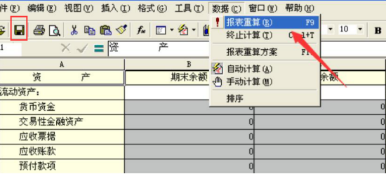 10. 最后,回到资产负债报表页面,点击“数据”菜单中的“报表重算”,金蝶 k 3 系统便会自动生成资产负债报表。确认数据无误后,点击保存按钮即可。