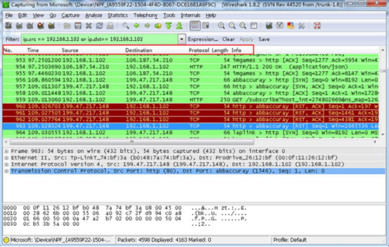 3. 要看懂 wireshark 抓包数据,还得了解数据包顶部标题栏到底代表什么。No.是数据包的标号;Time 是 wireshark 抓包的用时;Source 是 IP 来源;Destination 是目的 IP;Protocol 是协议;Length 是数据包的长度;Info 是数据包信息。