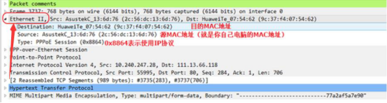 6. 当点击展开“Ethernet II”的时候,可以从中看到 wireshark 数据包的目的和源 MAC 地址和使用 IP 协议。