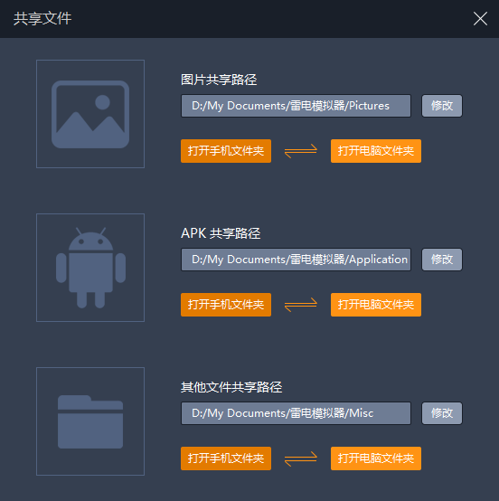 3. 在“共享文件”界面可以看到有“共享图片、APK、文件”三种共享路径,由于我们想要将模拟器中的图片共享到电脑中,所以我们先点击“图片共享路径”中的“打开手机文件夹”;