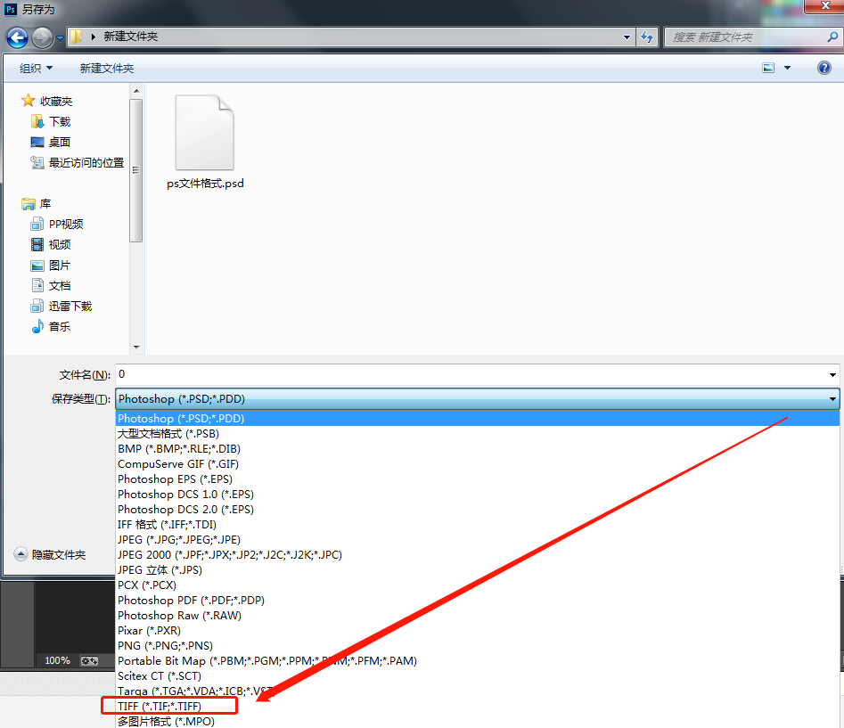 在 Photoshop 的存储窗口中选择另存为 TIFF 格式,然后点击保存。