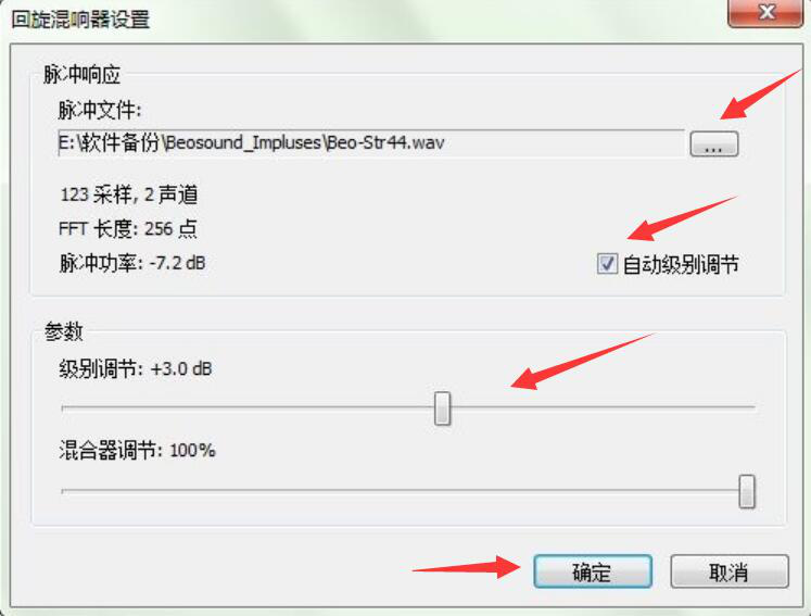 3. 接下来就是对插件的设置。先设置“回旋混响器”,打开该设置界面,设置脉冲文件存放的路径、勾选自动级别调节、将参数调节到 +3.0 dB,点击确定按钮。
