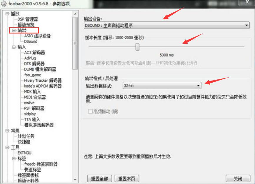9. 为了实现无损音乐播放器 foobar 2000 最好的音质,用户还需要在主界面左侧点击“输出”。将输出设备设置为“DSOUND:主声音驱动程序”,将缓冲长度调大,输出数据格式为 32-bit。