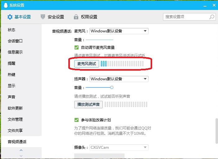7. 如果录制视频需要连接麦克风,那么就要考虑是不是麦克风的问题。可以用 QQ 来测试,按图示步骤找到并点击“麦克风测试”用麦克风说话。