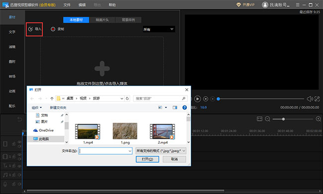 点击“导入”,弹出对话框,选择视频素材进行上传,你也可以直接将视频拖拽至素材区域;视频导入成功,点击素材上的“+”,或右击选择“添加到轨道”命令,->将素材添加至轨道。