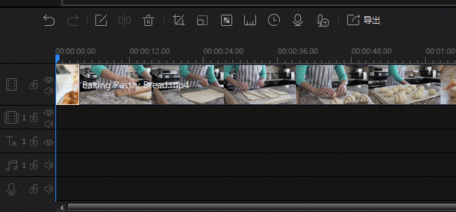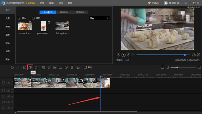 如果视频中有一些多余的画面片段,可以将其删除,选中轨道内某个素材,移动蓝色的时间线至某时间点,然后点击“分割”按钮,删除多余片段。