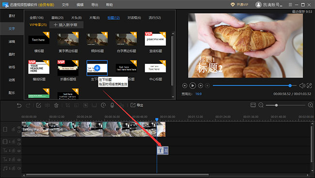 点击“文字”,从页面中选择字幕分类,下载一个字幕模板,并将对应的字幕模板添加至文字轨道,双击轨道中的模板,可以编辑字幕;另外,在预览框中还可以调整对应字幕位置。