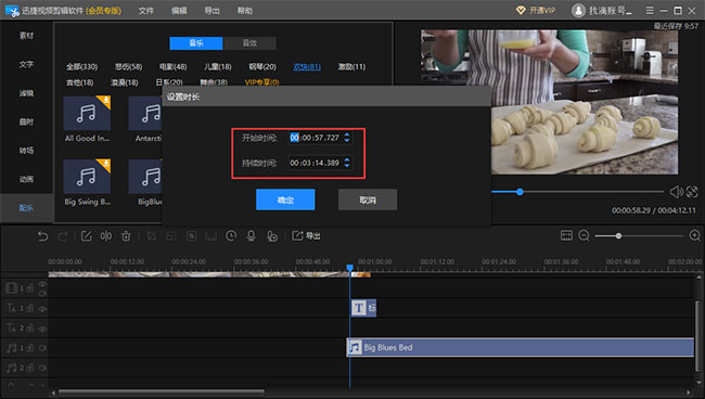 如果想要加入背景音乐来烘托气氛,可以选择导入外部的音频文件,也可以使用软件自带的模板,无论选择哪种方式,都需要将音频导入轨道,选中轨道上的音乐,点击时长,可以调整背景音乐的持续时间。