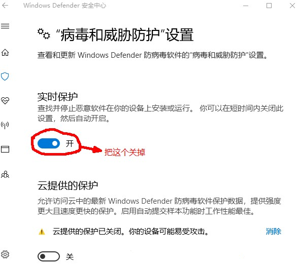 打开 Windows Defender 安全中心,如图,点击“病毒和威胁防护”->“病毒和威胁防护设置”,取消打开“实时保护”功能,
